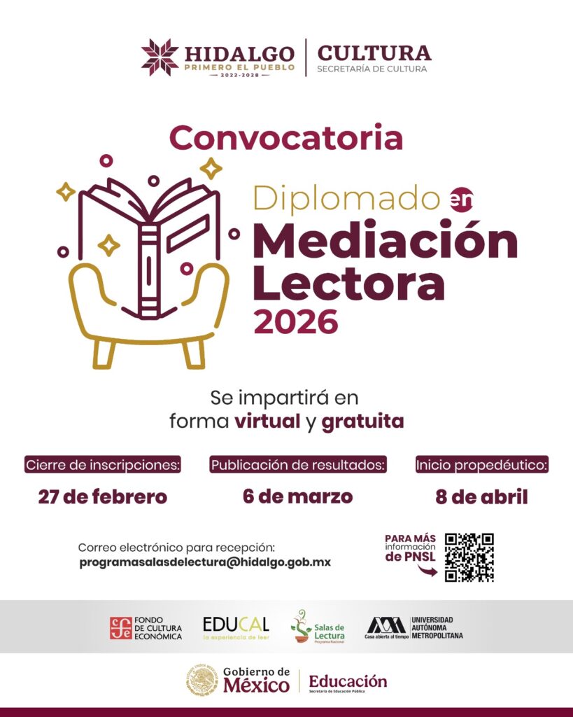 La Secretaría de Cultura del Estado de Hidalgo, en coordinación con el Programa Nacional de Salas de Lectura (PNSL), impulsa el Diplomado en Mediación Lectora 2026, una convocatoria abierta y gratuita orientada a fortalecer la formación de personas interesadas en promover la lectura como práctica comunitaria y de transformación social.