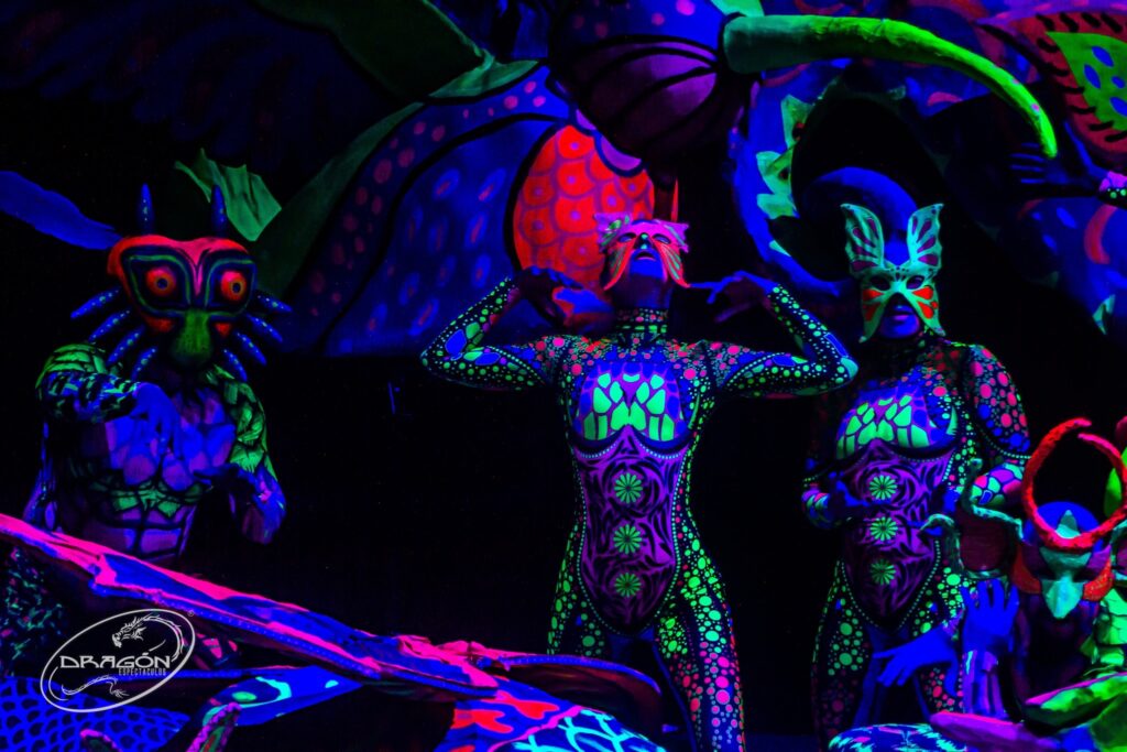 Con una gran producción, 16 talentosos artistas cautivan con números de malabarismo, acrobacia, danza aérea, equilibrio y danza, envueltos en un ambiente sensorial con humo, luces y efectos visuales que transforman el escenario. Los vestuarios fluorescentes y maquillajes brillantes intensifican la experiencia, generando un espectáculo hipnótico.