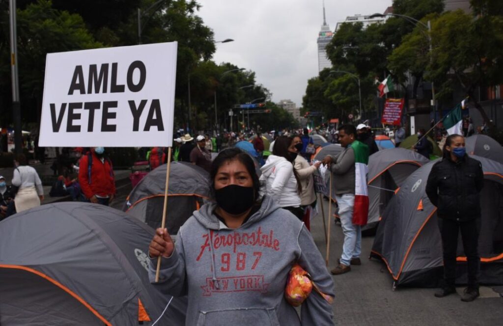 El campamento se mantiene en la Avenida Juárez de la Ciudad de México como protesta para exigir la renuncia de López Obrador quien les pidió tomar algún parque cercano para dejar libre el Zócalo para utilizarlo y luego, dijo, volver a instalarse.