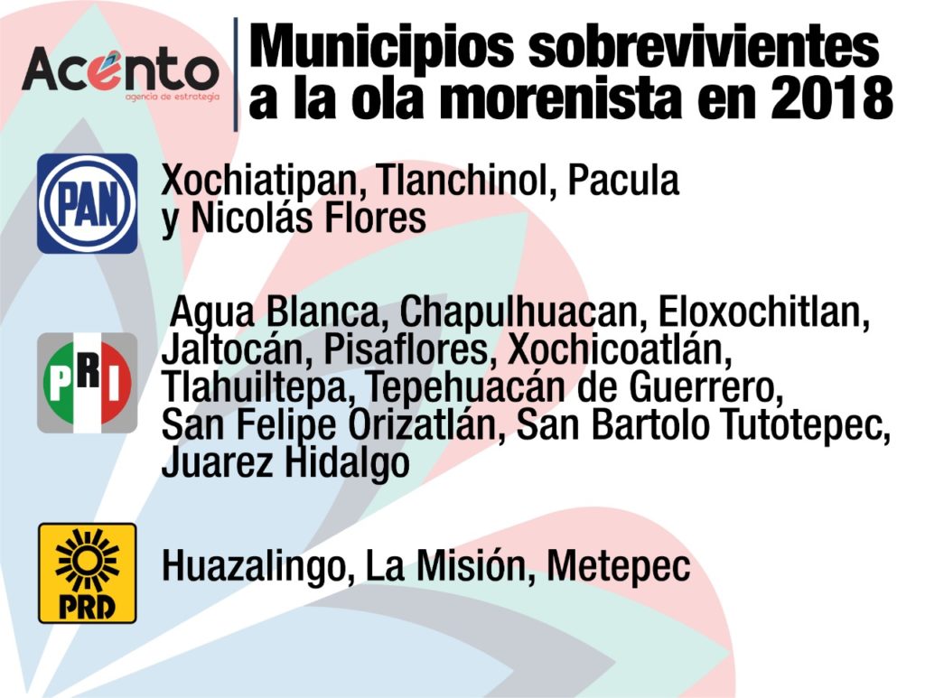 Hubo municipios que se inclinaron por el PRI como San Felipe Orizatlán, San Bartolo, Juárez Hidalgo, Chapulhuacán, Tlahuiltepa, Tepehuacán de Guerrero, Agua Blanca, Eloxochitlán, Jaltocán, Pisaflores, Xochicoatlán, en algunos de estos municipios gobierna, pero incluso en algunos de ellos no, lo que denota una importante trabajo y arraigo.
