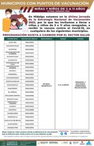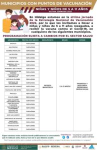 La Secretaría del Bienestar de Hidalgo dio a conocer que del 12 de diciembre al 16 del mismo mes, llevan a cabo la última jornada de vacunación contra el Covid-19 del 2022, para niñas y niños de 5 a 11 años.