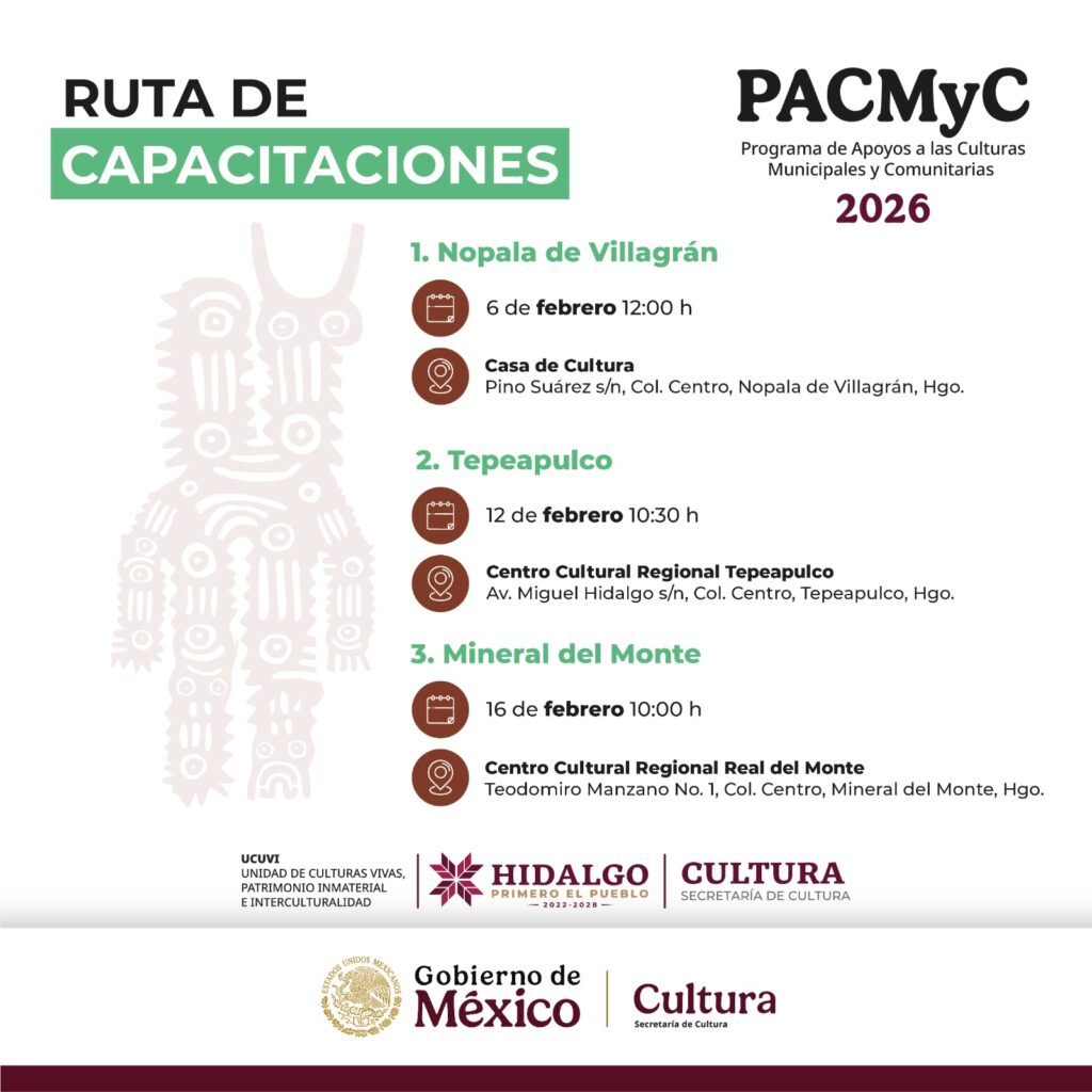 Este 6 de febrero iniciaron las capacitaciones del Programa de Apoyos a las Culturas Municipales y Comunitarias (PACMyC) 2026, con el arranque de la ruta formativa en Nopala de Villagrán, como parte del acompañamiento que se brinda a las comunidades interesadas en desarrollar proyectos culturales con impacto local.