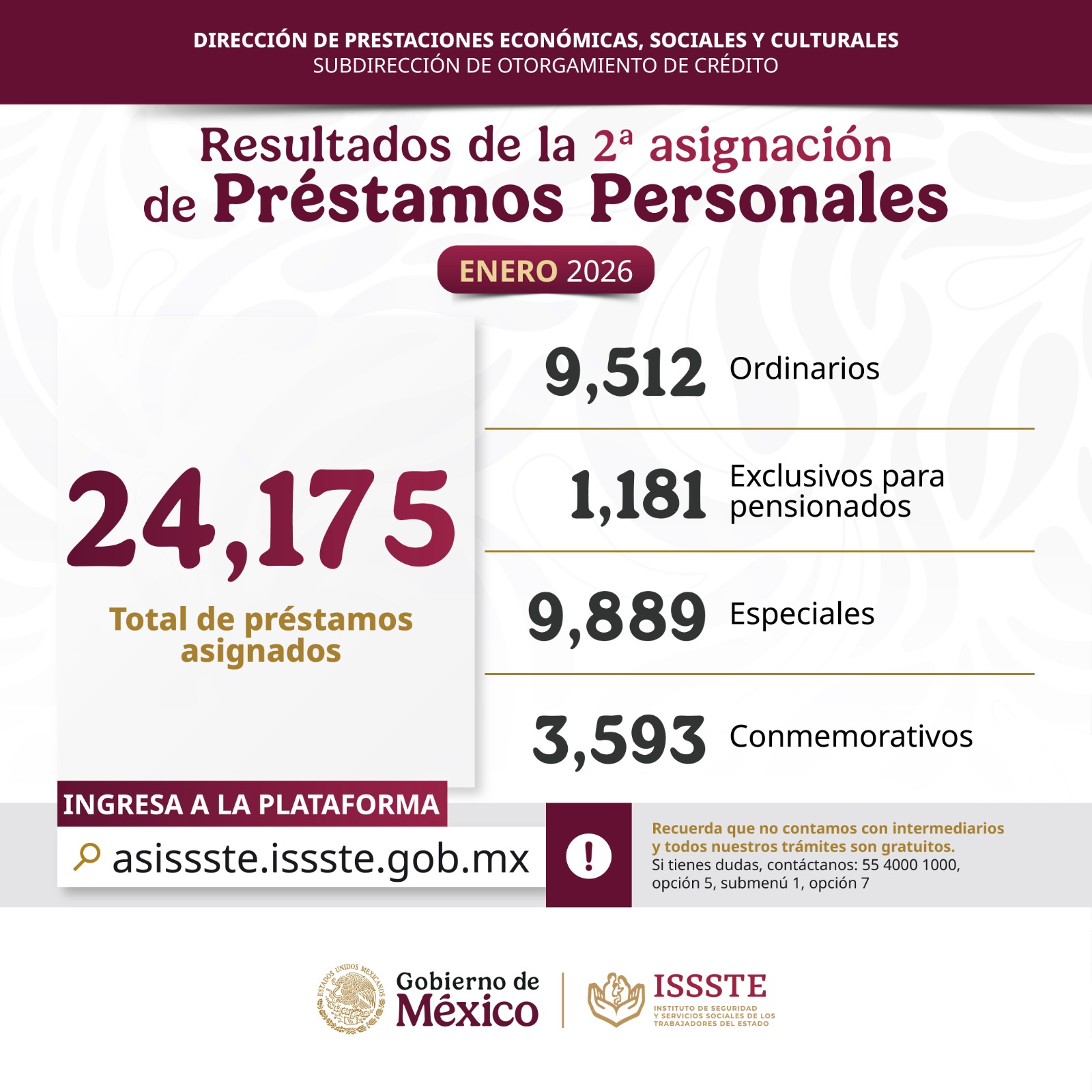El Instituto de Seguridad y Servicios Sociales de los Trabajadores del Estado (ISSSTE), encabezado por el director general Martí Batres Guadarrama, informa que en el segundo Programa Anual de Préstamos Personales 2026 se asignaron 24 mil 175 créditos a personas trabajadoras, pensionadas y jubiladas que cumplieron con los requisitos establecidos.