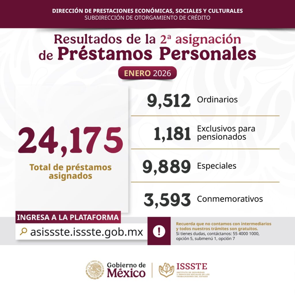 El Instituto de Seguridad y Servicios Sociales de los Trabajadores del Estado (ISSSTE), encabezado por el director general Martí Batres Guadarrama, informa que en el segundo Programa Anual de Préstamos Personales 2026 se asignaron 24 mil 175 créditos a personas trabajadoras, pensionadas y jubiladas que cumplieron con los requisitos establecidos.