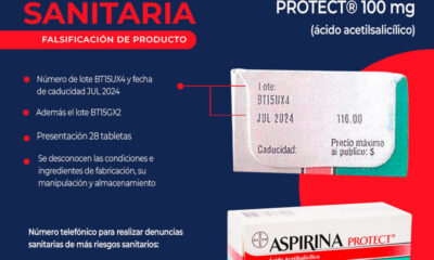 La Comisión Federal para la Protección contra Riesgos Sanitarios (Cofepris) emitió alerta sanitaria a la población por la falsificación de Aspirina Protect 100 mg. Bayer de...