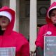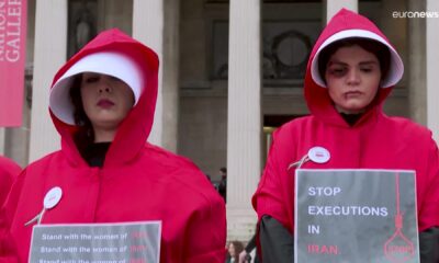 Protesta frente a la National Gallery de Londres de mujeres y activistas iraníes vestidas como en la serie de «El cuento de la criada«, para concienciar...