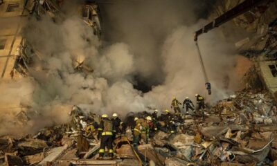 Rescate nocturno tras el impacto de un misil ruso en un edificio de 9 plantas en Dnipro. Los bomberos y los servicios de emergencia bajan por...
