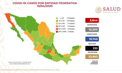 México, 10 Abril (Notimex).- Hasta este viernes se han reportado tres mil 844 casos positivos de COVID-19 y 233 fallecimientos en México, afirmó el director general...