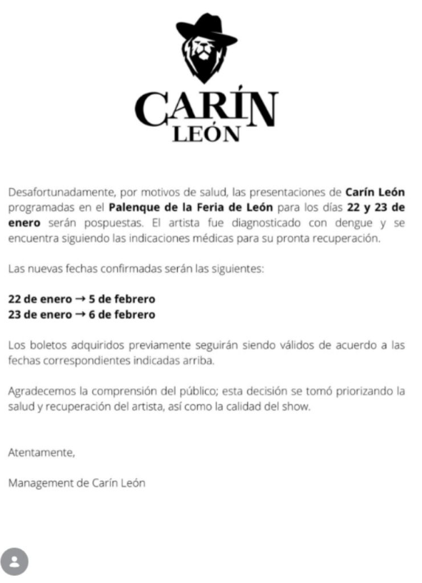 «Desafortunadamente, por motivos de salud, las presentaciones de Carín León programadas en el Palenque de la Feria de León para los días 22 y 23 de enero serán pospuestas.