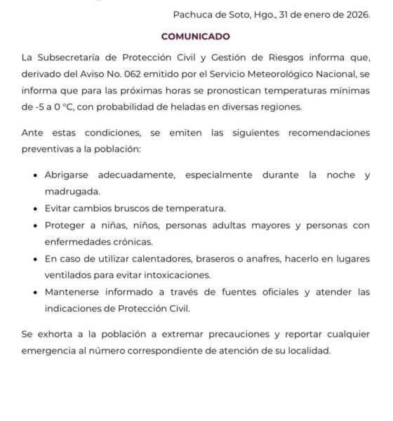 La Subsecretaría de Protección Civil y Gestión de Riesgos del Gobierno del Estado de Hidalgo informa a la población que, con base en el Pronóstico Extendido...