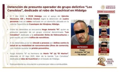 En Cuautepec fue detenido Hugo Antonio, «El Aries«, presunto integrante del grupo delictivo «Los Cenobios», informó el subsecretario de Seguridad Ciudadana, Luis Rodríguez. En conferencia de...