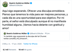 Chumel Torres fue señalado por la esposa del presidente Andrés Manuel López Obrador, Beatriz Gutiérrez Müller en redes sociales donde manifestó su descontento por la participación de Chumel Torres luego de que el comediante hiciera comentarios burlones sobre el hijo del mandatario mexicano.