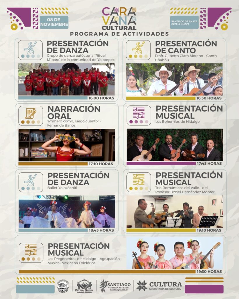 La Caravana Cultural es un esfuerzo conjunto entre la Secretaría de Cultura del Estado de Hidalgo y el ayuntamiento de Santiago de Anaya, con el propósito de fortalecer la vida artística del estado y reconocer la diversidad creativa que distingue a cada región.