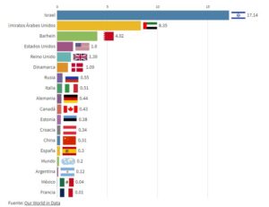 Por debajo de Israel (17.14) en la tabla que compara el número total de dosis de vacunación administradas por cada 100 personas de la población total, se encuentran los Emiratos Árabes Unidos con 8.35, luego Bahréin con 4.02, Estados Unidos con 1.6, Reino Unido con 1.39, Dinamarca con 1.09, Rusia con 0.55, Italia con 0.51, Alemania con 0.44 y Canadá con 0.43 vacunados cada 100 personas. El total global corresponde a 0,2.