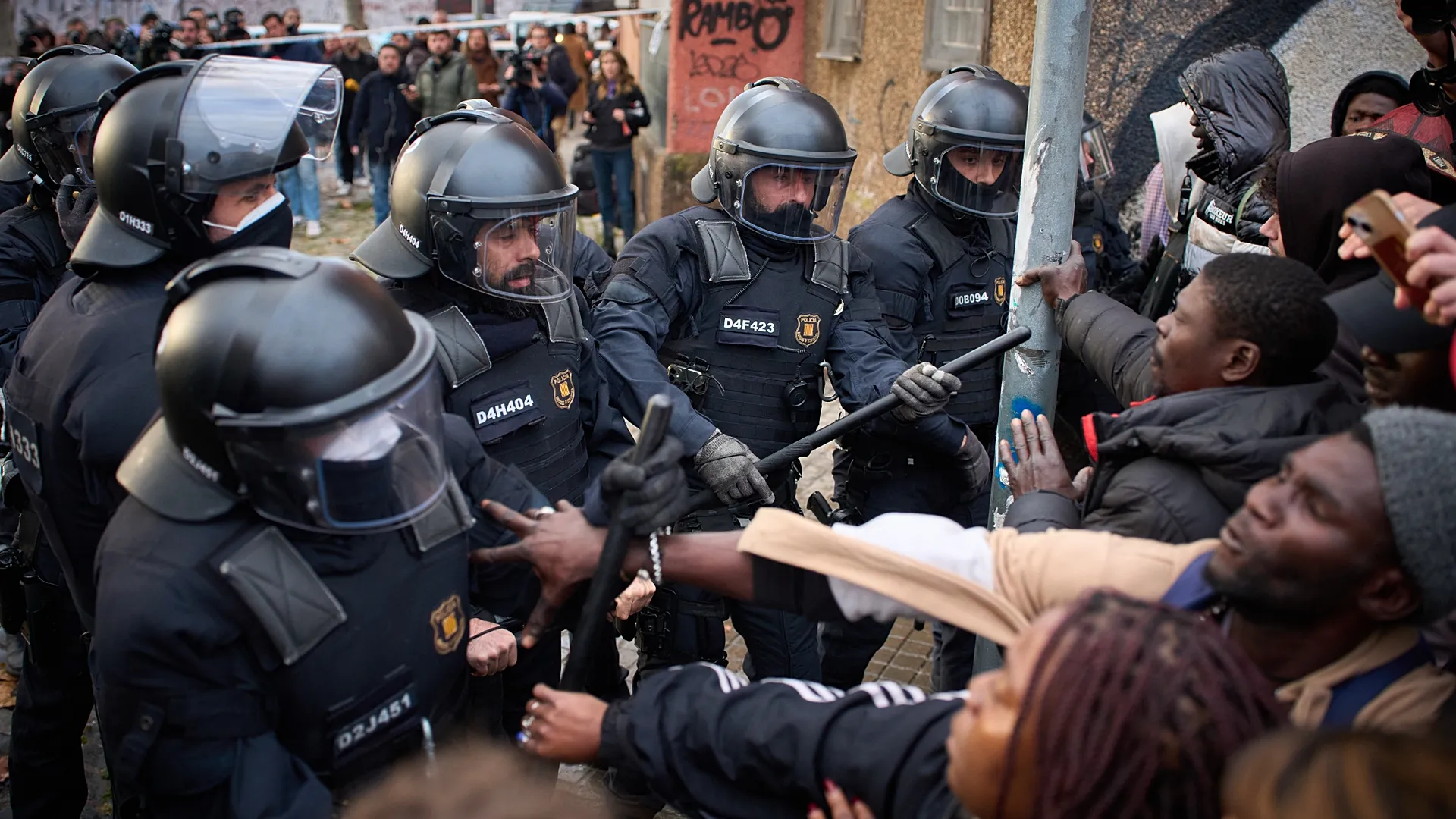 Los migrantes después de ser desalojados por la Policía de una escuela abandonada en Badalona, ​​España, el 17 de diciembre de 2025.