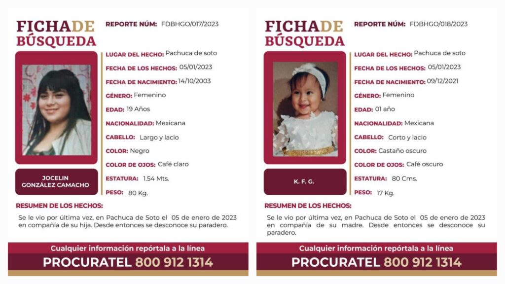 La Procuraduría General de Justicia de Hidalgo emitió una ficha de búsqueda para localizar a Jocelin González Camacho y una pequeña de un año de nacida, identificada con las iniciales K. F. G., vistas por última vez las dos en el municipio de Pachuca, el pasado 5 de enero del 2023.