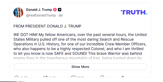 Una frenética operación de búsqueda y rescate estadounidense se desplegó tras el accidente del F-15E Strike Eaglejet el viernes, mientras Irán también prometía una recompensa para quien entregara al «piloto enemigo.» «Este valiente Guerrero estaba tras las líneas enemigas en las traicioneras montañas de Irán, siendo perseguido por nuestros enemigos, que se acercaban más y más cada hora», escribió.