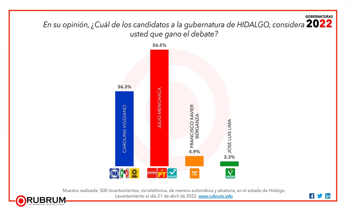 En el caso del sondeo telefónico realizado por la empresa Rubrum luego del debate entre aspirantes al gobierno de Hidalgo, el 56.5 por ciento de las personas entrevistadas consideraron que el candidato de Morena, PT y PNAH fue el ganador de este ejercicio democrático.