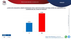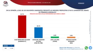 Massive Caller dio a conocer que ante la pregunta “En su opinión, ¿cuál de los siguientes candidatos presentó las mejores propuestas y fue el ganador del debate en términos generales?”, el 67 por ciento dijo que Julio Menchaca.