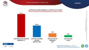 Mientras tanto, el 36.3 declaró sus preferencias a favor de Carolina Viggiano Austria, abanderada de la coalición “Va por Hidalgo”. En tercer lugar quedó Berganza Escorza con el 4.9%, y al final, José Luis Lima Morales con el 2.3% de las opiniones.