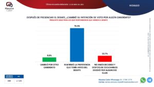 También se muestra que el 71 por ciento de los consultados que siguieron la transmisión reafirmó la preferencia que tenía antes del debate, mientras que el 13 por ciento no había decidido y lo hizo después de escuchar a la y los candidatos; asimismo, el 9.3 por ciento cambió sus preferencias por otro candidato.