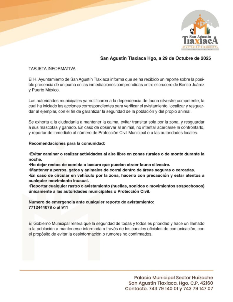 La tranquilidad de San Agustín Tlaxiaca se vio alterada tras el reporte de la presencia de un puma en la zona comprendida entre el crucero de Benito Juárez y Puerto México.