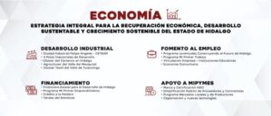 Por otra parte, Miguel Tello, coordinador de comunicación de la campaña de Menchaca Salazar, dio a conocer que la Estrategia de Economía contempla la creación de la Ciudad Industrial de Desarrollo y de la Financiera Estatal de Desarrollo, en la que se tienen previstos programas sociales que permitirán potencializar la economía del sector productivo del estado de Hidalgo, destacando el Programa Mi Primer Emprendimiento, Créditos a la Palabra y las Tandas del Bienestar.