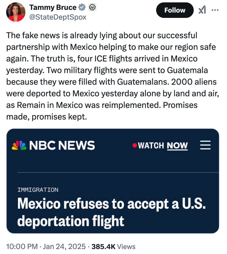 Luego de que trascendiera que México rechazó una solicitud del gobierno del presidente Donald Trump para permitir que un avión militar estadounidense que iba a deportar migrantes aterrizara en el país, Tammy Bruce, portavoz del Departamento de Estado, negó la información.