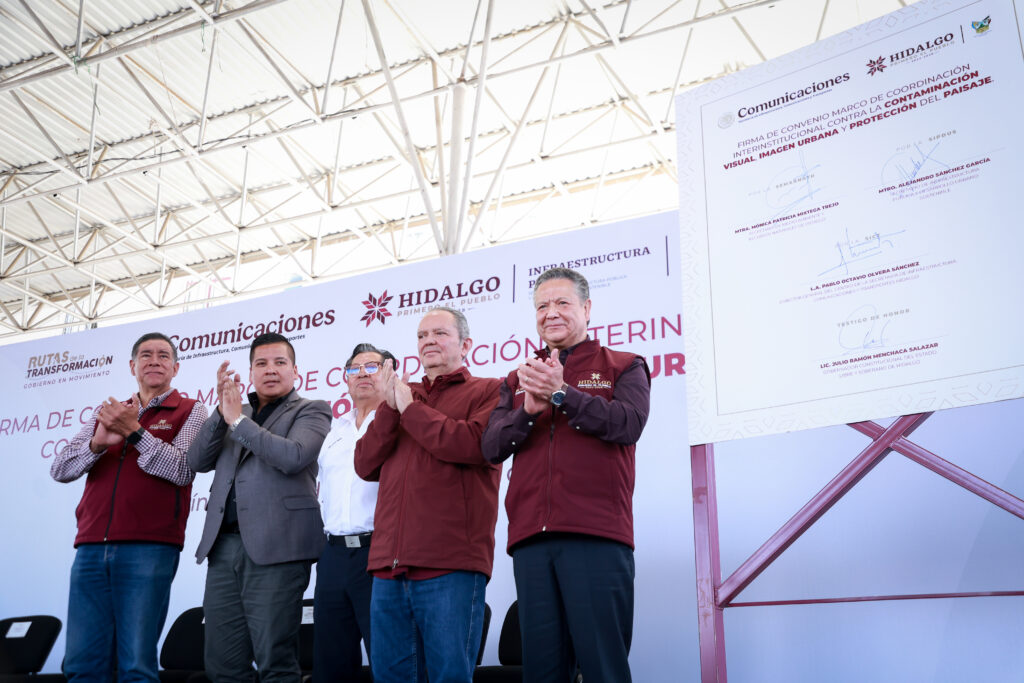 En el marco de las Rutas de la Transformación y con el compromiso de recuperar el orden y la armonía de los espacios públicos, el gobernador Julio Menchaca Salazar testificó la firma del convenio de coordinación contra la Contaminación Visual, Imagen Urbana y Protección del Paisaje entre el Gobierno de Hidalgo y la federación, a través de la Secretaría de Infraestructura, Comunicaciones y Transportes (SICT).