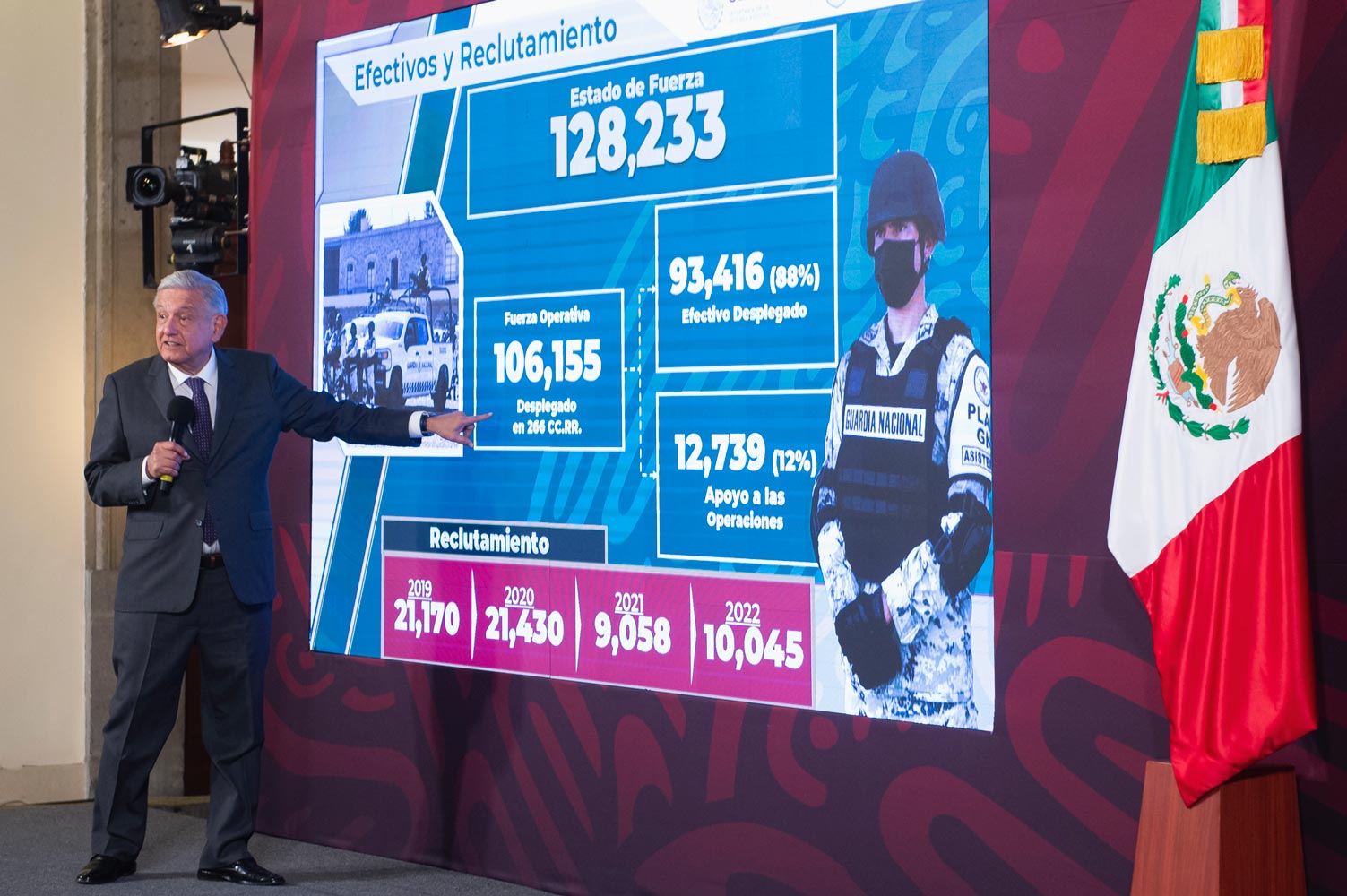 El presidente López Obrador destacó que la Guardia Nacional tiene presencia en las 32 entidades federativas; a la fecha suman 128 mil 233 integrantes de la corporación, que tiene el objetivo de velar por la seguridad de la población.