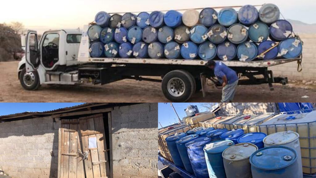 Ahí las autoridades hallaron seis contenedores con capacidad de 200 litros abastecidos con hidrocarburo, además de 255 depósitos de 200 y mil 200 litros vacíos, 300 gramos de hierba verde y 20 dosis de sustancias ilícitas con características de droga “cristal” y “éxtasis”.