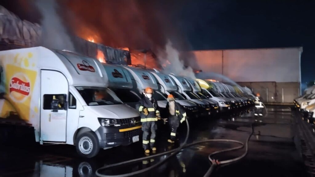 A través de redes sociales circulan videos de la magnitud del fuego que se originó al interior de una bodega en la fábrica de Sabritas, varios vehículos con la marca plasmada terminaron en llamas.