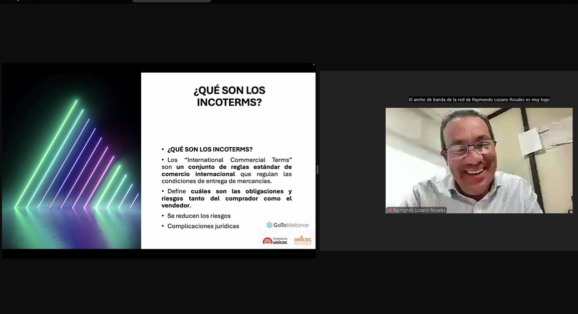 Tal es el caso de la conferencia “Incoterms”, impartida por Raymundo Rosales Lozano, investigador y catedrático de la UPT, a exalumnos de la Institución Universitaria Colegios de Colombia (Unicoc).