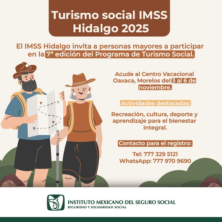 El Instituto Mexicano del Seguro Social (IMSS) en Hidalgo, a través de la Oficina de Bienestar Social y Atención a Pensionados, invita a personas mayores a participar en la séptima edición del Programa de Turismo Social, que se llevará a cabo del 3 al 6 de noviembre de 2025 en el Centro Vacacional Oaxtepec, Morelos, bajo la temática “Diversión Vaquera”.