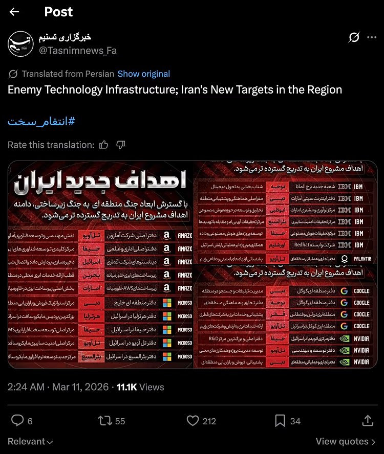 La agencia informa en X de que compañías como Amazon, Microsoft, Google, Oracle, Nvidia, IBM y Palantir, repartidos en alrededor de 30 ubicaciones de Oriente Medio, son los «nuevos objetivos de Irán en la región». El mensaje afirmaba que estos emplazamientos han sido identificados como «infraestructura tecnológica enemiga».