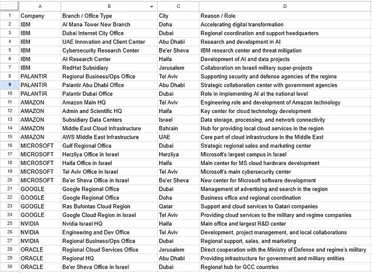 Cuatro oficinas de Oracle, IBM y Google en Jerusalén, Tel Aviv y Abu Dabi han sido así mismo mencionadas porque, según la publicación, proporcionan infraestructura a «entidades militares».