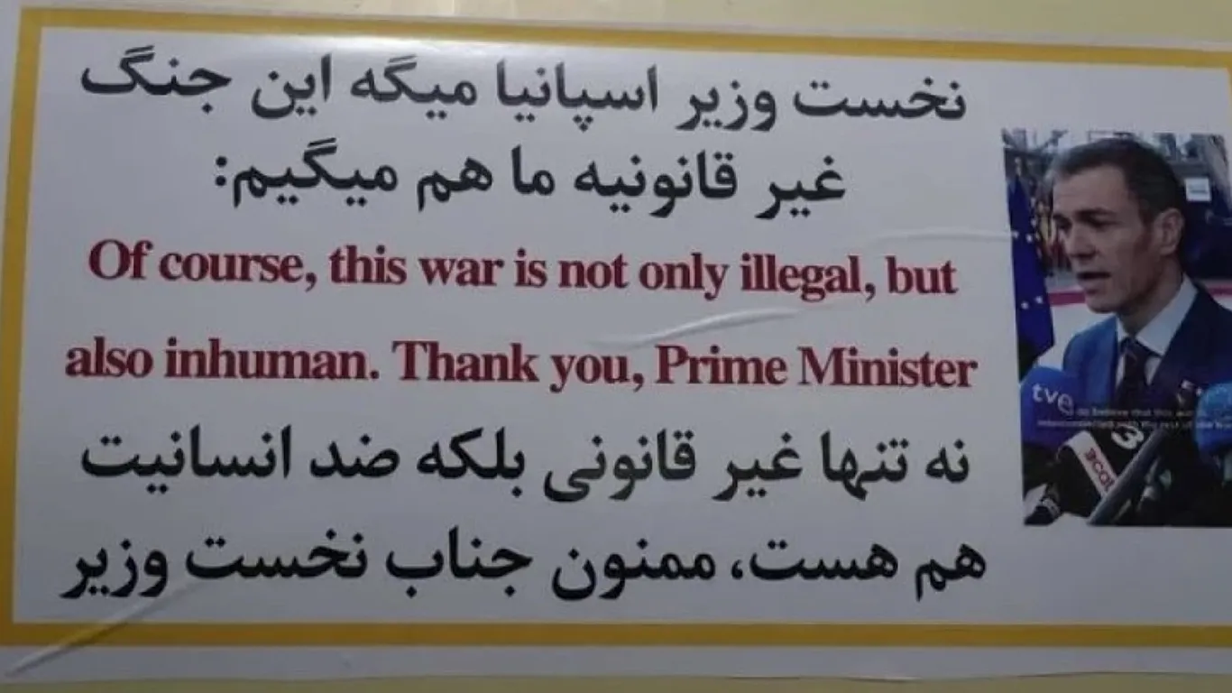 En el adhesivo se reproduce una frase atribuida al dirigente español, en la que califica la guerra de «ilegal«, junto a un mensaje de agradecimiento por parte de Irán. El texto, repetido en varios idiomas, añade que el conflicto no solo sería ilegal, sino también «inhumano».