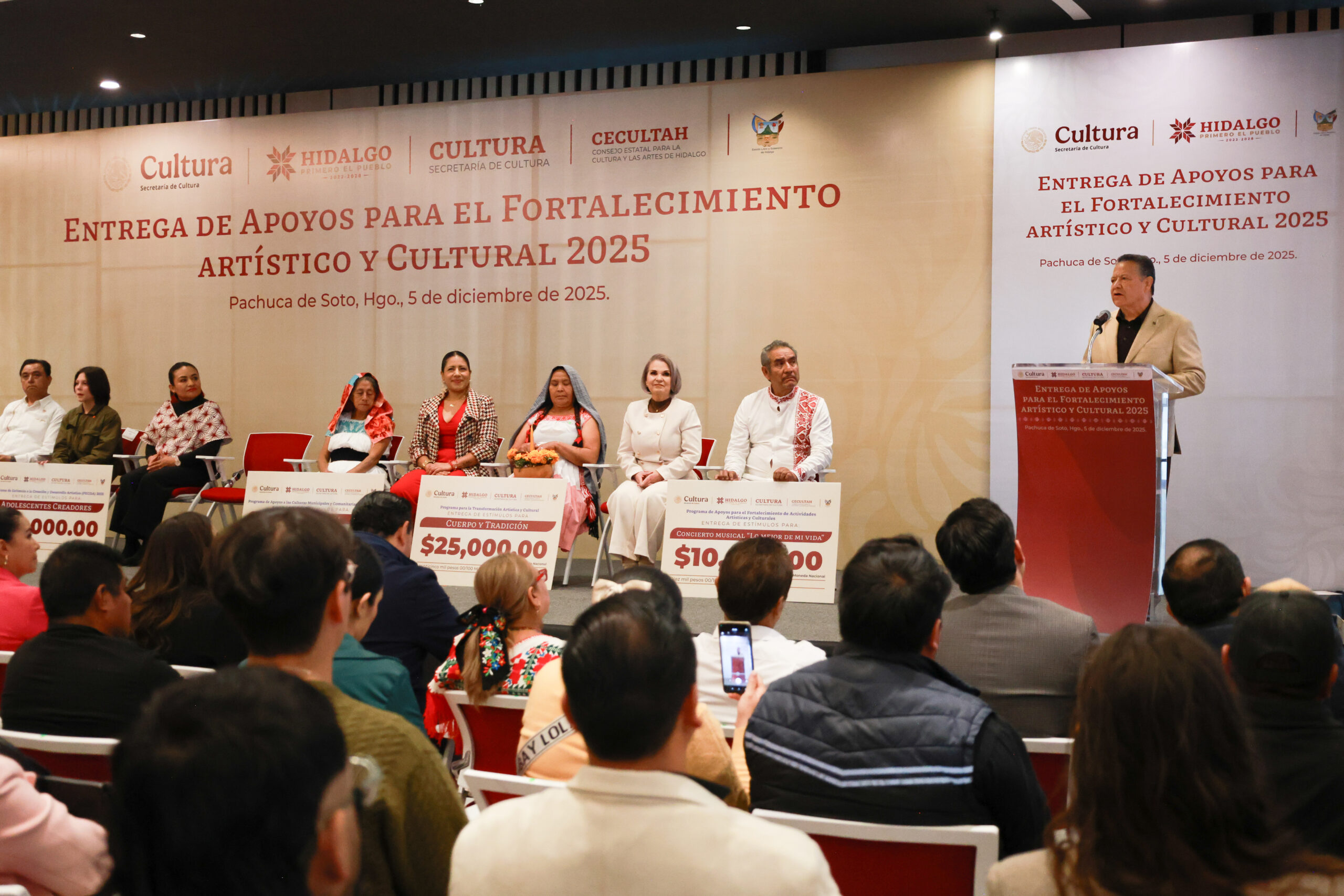 El gobernador de Hidalgo, Julio Menchaca Salazar, encabezó la entrega de Apoyos para el Fortalecimiento Artístico y Cultural 2025 a 453 creadoras y creadores, quienes fueron reconocidos por su labor, talento y compromiso con la preservación de la cultura y las tradiciones hidalguenses.