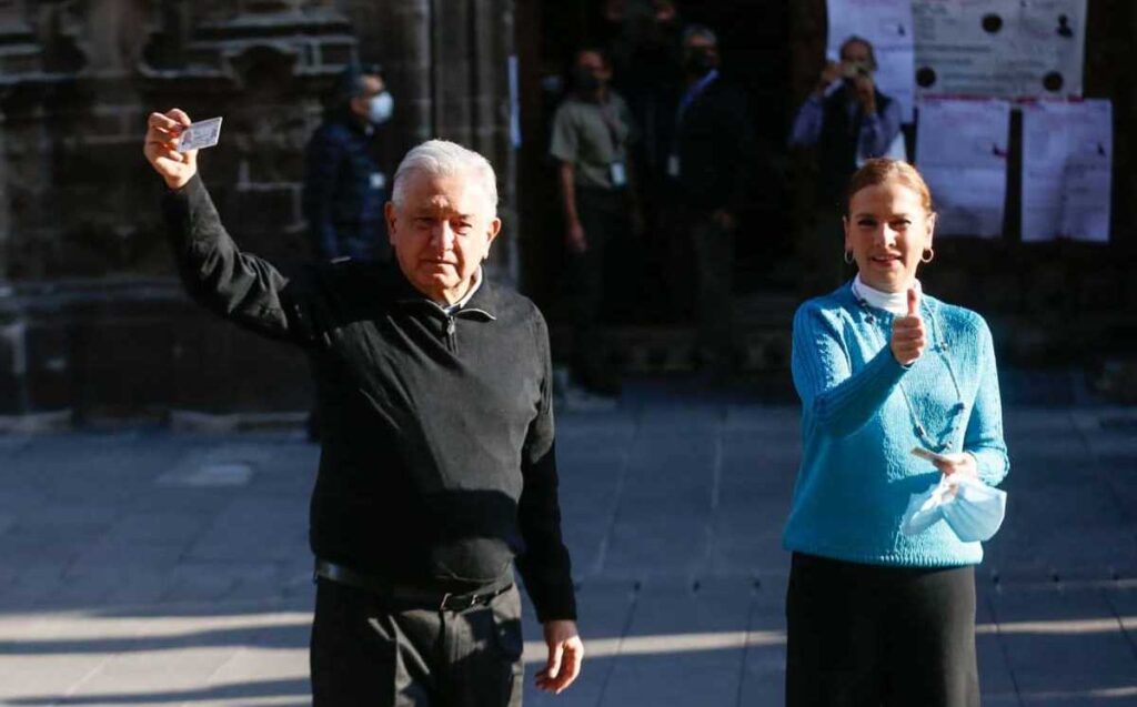 El mandatario acudió esta mañana a la casilla ubicada en el Antiguo Palacio del Arzobispado, acompañado por su esposa, la historiadora Beatriz Gutiérrez Müllery ambos fueron abordados por ciudadanos para tomarse una fotografía. Se pusieron el cubrebocas previo a ingresar.