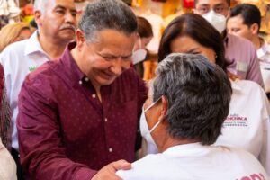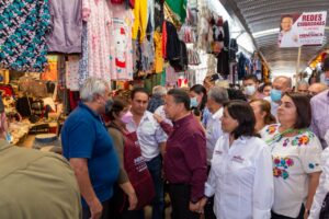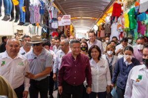 Julio Menchaca Salazar, candidato de Morena, Partido Nueva Alianza Hidalgo y Partido del Trabajo, recorrió la Plaza del Vestido para saludar a mujeres y hombres comerciantes en el municipio de Tulancingo, ante quienes se comprometió a encabezar un gobierno que responda a las necesidades de los diferentes sectores sociales.
