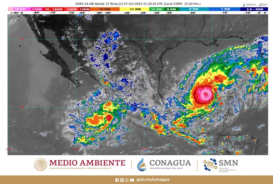 Su amplia circulación mantendrá el pronóstico de lluvias puntuales torrenciales (de 150 a 250 milímetros [mm]) en Campeche y Yucatán, intensas (de 75 a 150 mm) en Quintana Roo, Tabasco y Veracruz; así como rachas de viento de 180 a 200 km/h, oleaje de 6 a 8 metros (m) de altura y posible formación de trombas marinas en las costas del norte de Campeche y Yucatán; rachas de 100 a 120 km/h y oleaje de 4 a 6 m de altura en las costas de Veracruz y Tabasco, y de 80 a 100 km/h con oleaje de 3 a 5 m de altura en las costas de Tamaulipas y Quintana Roo. Asimismo, se prevé marea de tormenta de 1 a 3 m de altura sobre Campeche, Yucatán y el norte de Quintana Roo.