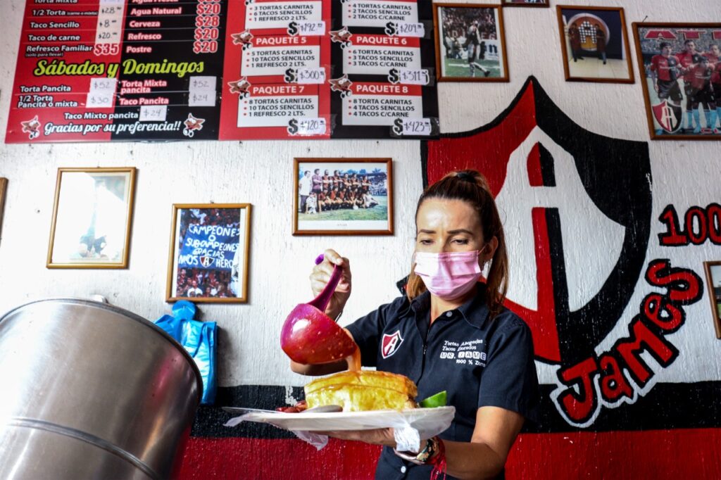 “Cuando el Atlas sea campeón, tortas y tacos gratis”, se lee en los muros del negocio en el que se ofrecen tortas, tacos y carnitas.