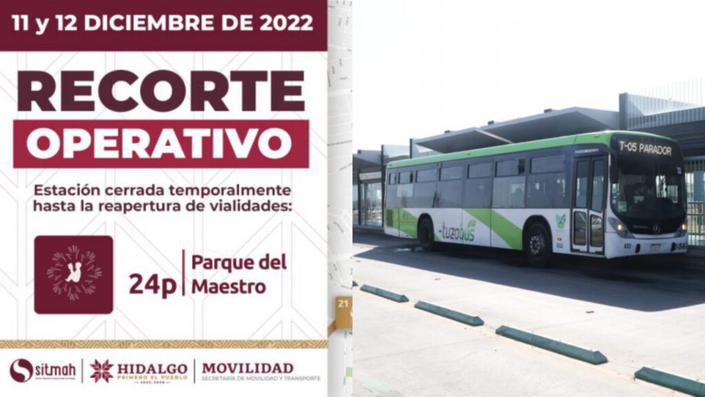Derivado de los festejos de la Virgen Guadalupe este 11 y 12 de diciembre la Secretaría de Movilidad y Transporte, (SEMOT), a través del Sistema Integrado de Transporte Masivo de Hidalgo (SITMAH), informó que los recorridos del Tuzobus cambiarán y la estación del Parque del Maestro se mantendrá cerrada temporalmente.