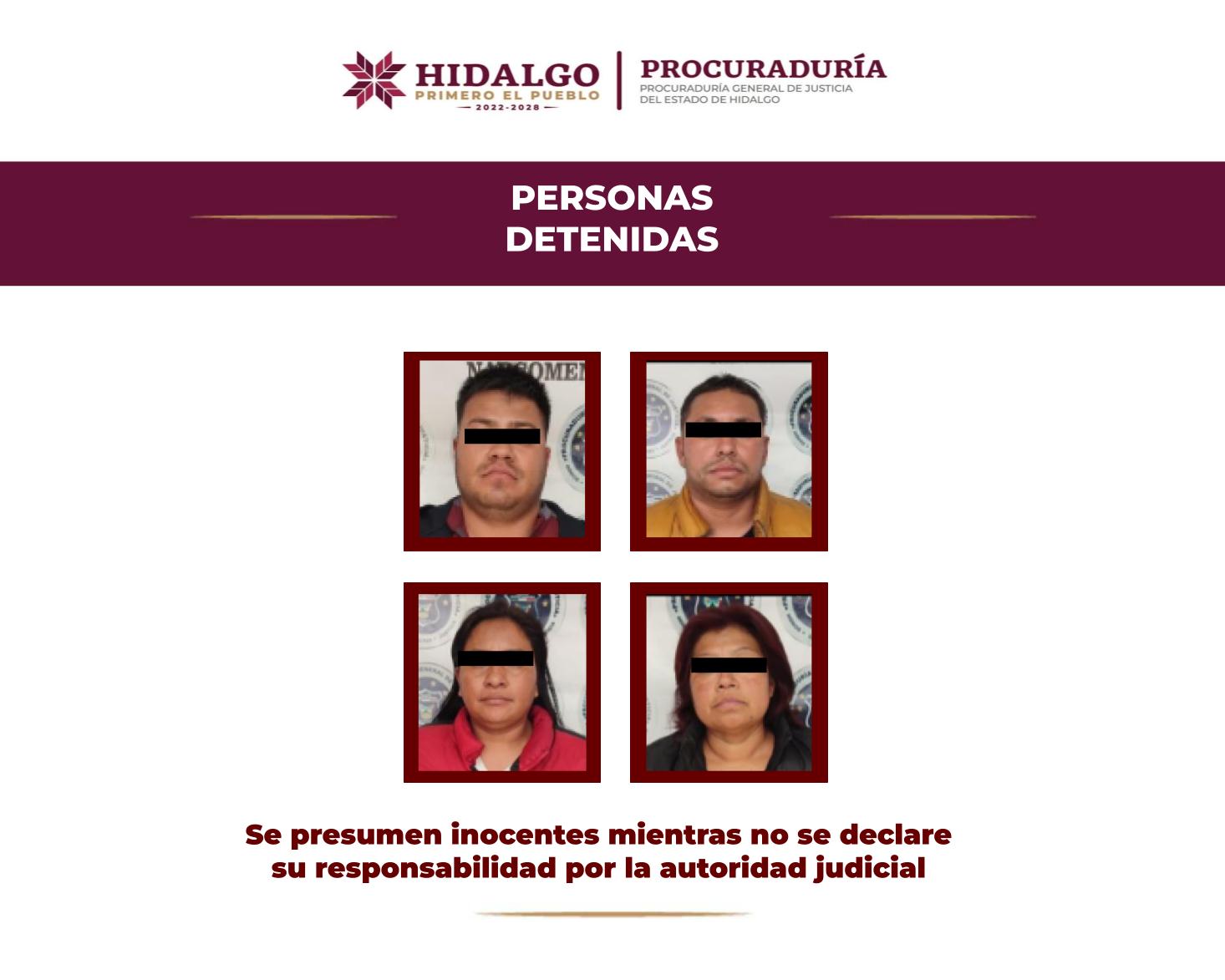 En el inmueble intervenido mediante orden judicial se detuvieron a cuatro personas identificadas con iniciales V. H. R. G., A. O. M., A. J. G. S., y B. Y. G. L., quienes son investigadas por hechos que la ley sanciona como narcomenudeo.