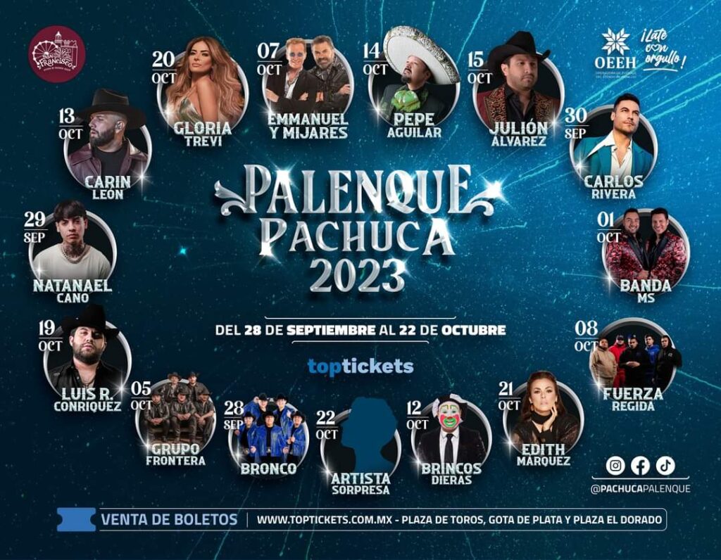 La Operadora de Eventos del Estado de Hidalgo (OEEH) en conjunto con la Secretaría de Turismo dieron a conocer de manera oficial el cartel del palenque de la Feria San Francisco 2023 de Pachuca, que se llevará a cabo del 28 de septiembre al 22 de octubre.