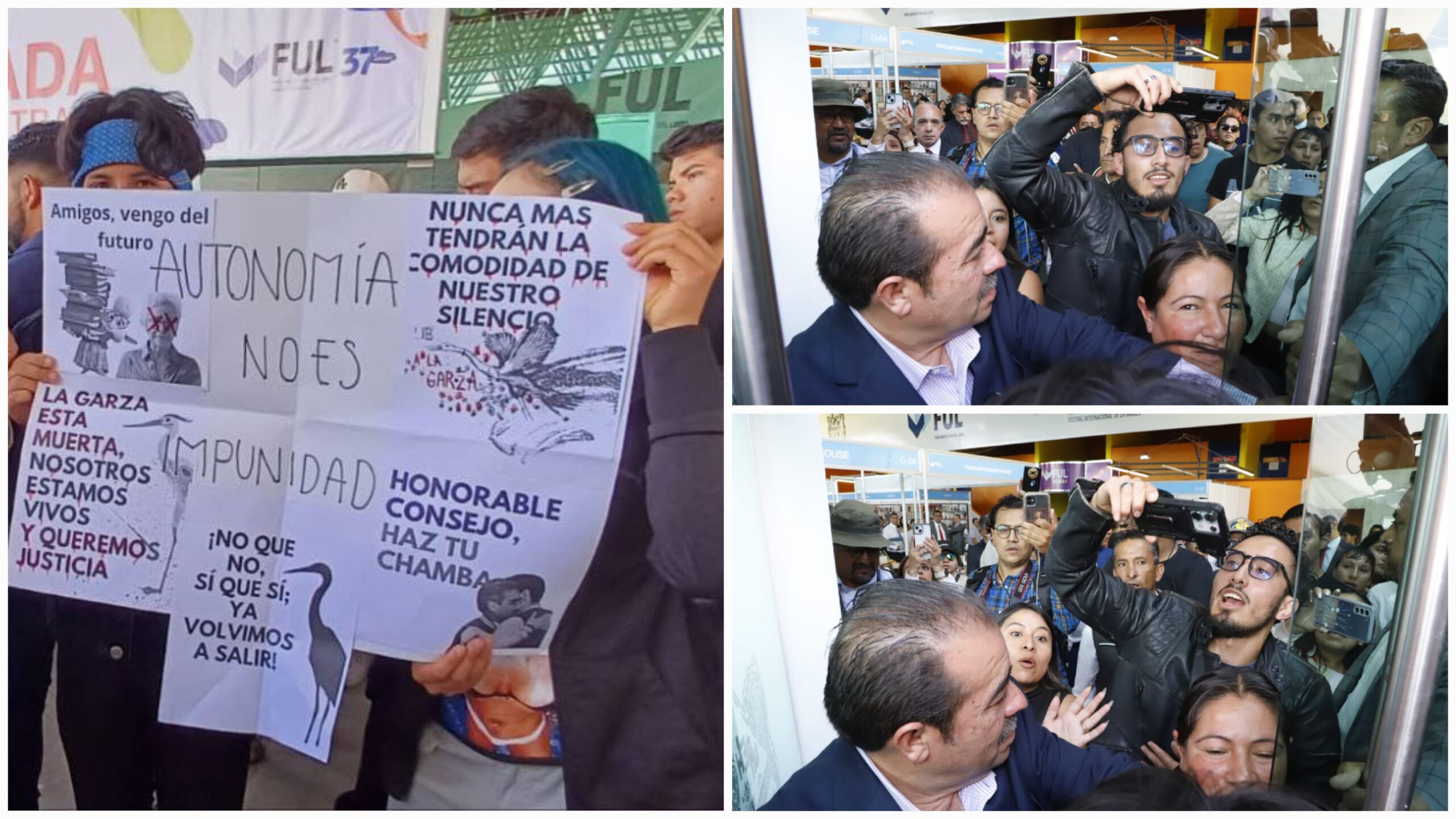 El integrante del Movimiento RebelArte subió al templete, en donde el rector de la UAEH, Octavio Castillo cortaba el listón de inauguración de la FUL para exigir que acepte la recomendación de la Comisión de Derechos Humanos y se disculpen públicamente por las agresiones ejercidas en contra de los alumnos el 19 de septiembre del 2023 en el edificio centra de Abasolo.