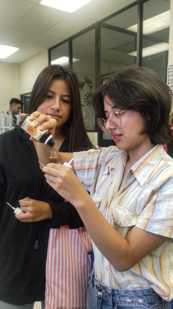 Posteriormente, las y los participantes se dirigieron a un laboratorio para poder aplicar y comprobar algunos de los beneficios del uso de la colmena. La práctica fue dirigida por la científica Gabriela Medina, y consistió en la elaboración de algunos productos como cremas y sprays para el tratamiento de afecciones en la piel, basados principalmente en el uso del propóleo y la miel, a fin de demostrar los resultados de algunas de las investigaciones realizadas.