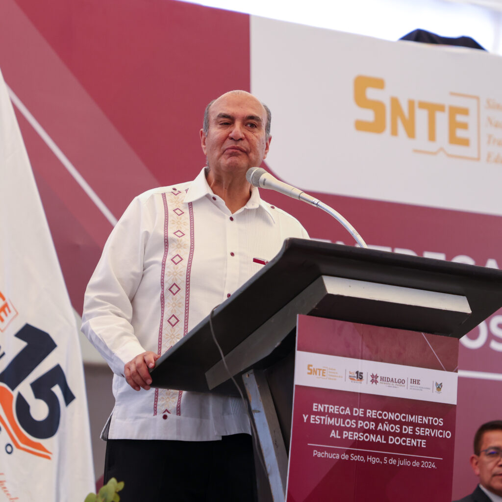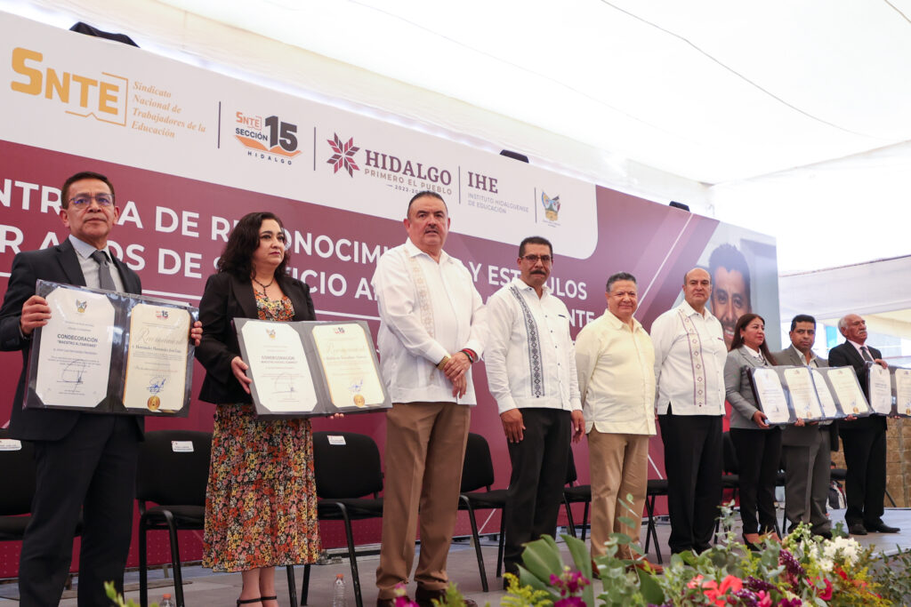 Durante la entrega simbólica de reconocimientos a docentes integrantes de la Sección 15 del Sindicato Nacional de Trabajadores de la Educación (SNTE) por su labor durante 20, 25, 30, 40 y 50 años, el gobernador de Hidalgo, Julio Menchaca Salazar reiteró el agradecimiento que existe hacia quienes acompañan la formación académica de miles de niñas, niños y adolescentes.