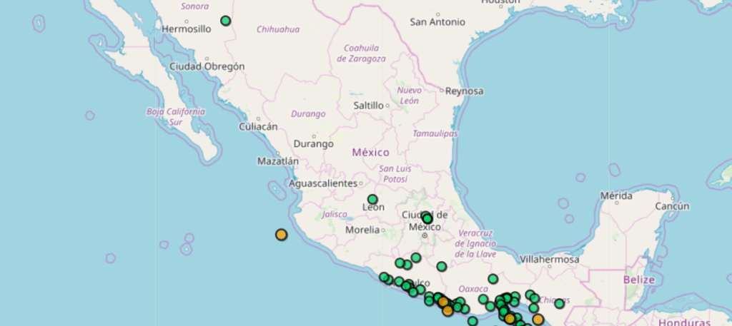 El organismo del Instituto de Geofísica de la UNAM dio a conocer que del total de sismos registrados en las últimas 12 horas, 16 fueron ubicados en diversas zonas de Oaxaca, siete en Guerrero, dos en Chiapas, dos en Hidalgo, dos en Baja California, uno en Jalisco, uno en Guanajuato y otro en Veracruz.