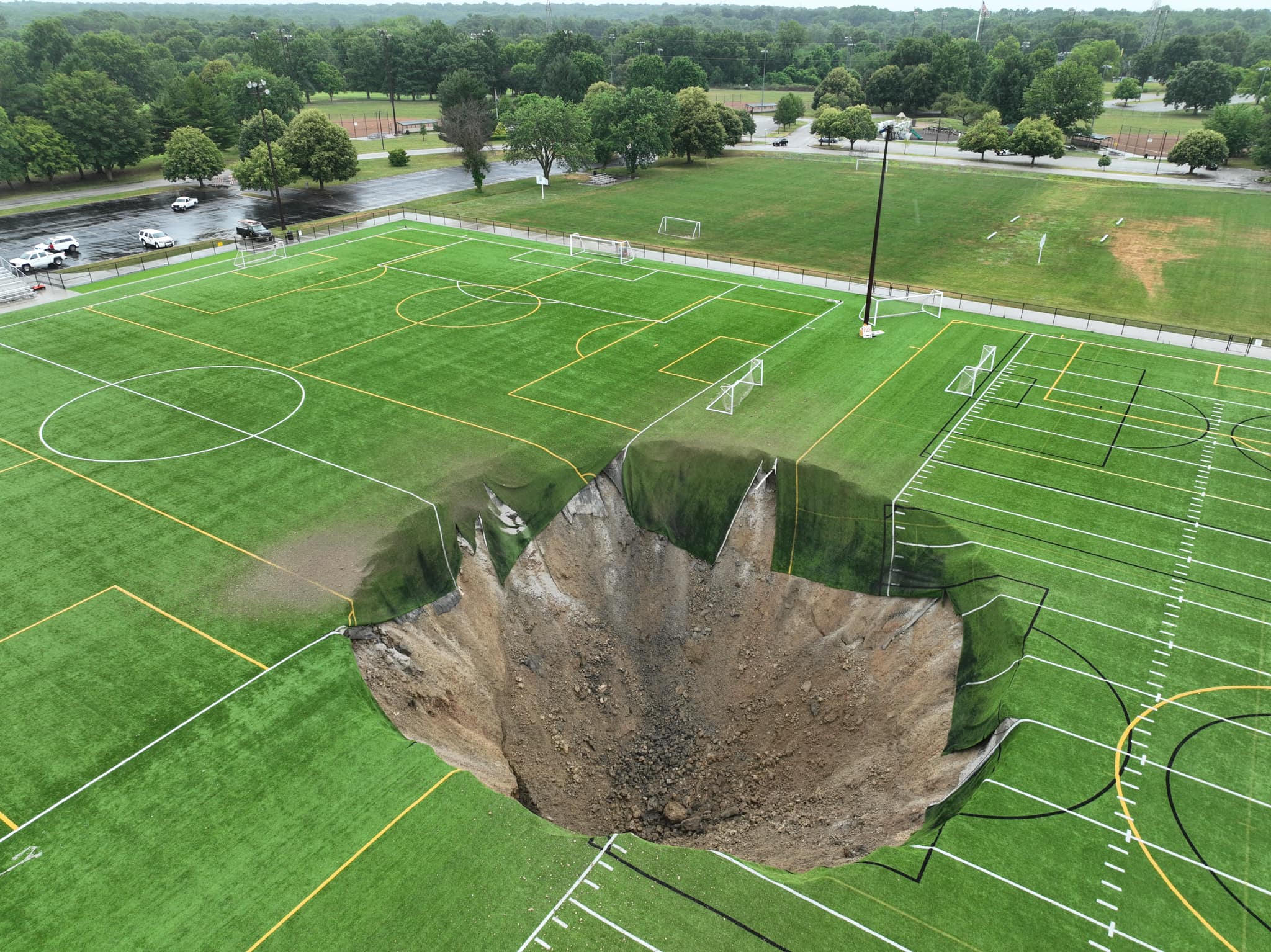 Se abre socavón en medio de un campo de fútbol en Estados Unidos